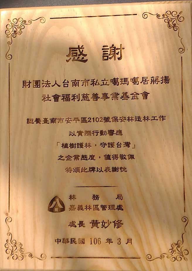 從呵護台灣開始,乃至關懷整個地球。請與蔣揚慈善基金會攜手保護山河海洋、造林綠化大地。希望願望早日實現,予以無量生命庇護安樂。我們期待微笑地看著,大冠鷲飛翔藍天自在呼嘯,鯨豚在碧海快樂逐浪,水鹿漫步山坡悠閒吃草……清風徐來,那枝葉搖曳,與婆娑之洋共舞,大自然的樂章,多麼神聖美好!